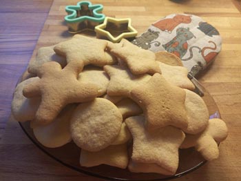 Фигурное песочное печенье 150 г сливочного масла, 420 г муки, 150 г сахара, 1 яйцо, 2 г пищевой соды. Сливочное масло комнатной температуры разотрите с сахаром. Вбейте яйцо, перемешайте. Муку просейте и смешайте с щепоткой соды. В смесь частями всыпьте муку и замесите крутое тесто. Долго тесто не вымешивайте, иначе печенье будет твердым. Тесто оберните пищевой пленкой и уберите на час в холодильник. После раскатайте его в пласт толщиной около 1 см и формочками сформируйте печенье. Выложите его на смазанный растительным маслом или застеленный пергаментом противень. Выпекайте в разогретой до 180°C духовке около 25 минут. Вынимайте печенье, когда оно зарумянится. Подавайте к чаю, какао или ешьте с молоком. |