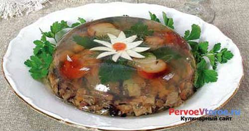 Очищенные грибы крупно нарежьте, отварите в небольшом количестве воды, откиньте на дуршлаг, а когда немного остынут – мелко порежьте. В грибной бульон вылейте предварительно замоченный желатин, немного посолите, поставьте на плиту и прогревайте, пока желатин полностью не разойдётся. В маленькие формочки налейте немного бульона с желатином и поставьте на холод, чтобы застыл. Сверху выложите кружочек вареного яйца, веточку петрушки, влейте грибной отвар и дайте этой красоте застыть. Перед подачей формочки на несколько секунд опустите в горячую воду и выложите аккуратно на тарелку.
