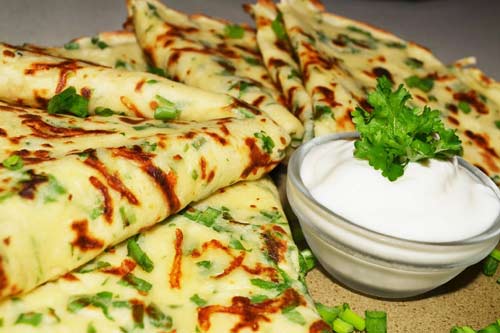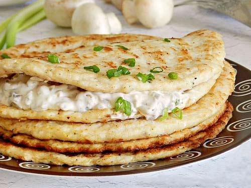 400 г картофеля, 300 мл молока, 1 яйцо, 1 зубчик чеснока, 1 ч. л. сахара, 1/2 ч. л. соли (+ для отваривания картофеля), 4 ст. л. подсолнечного масла (+ 2 ч. л. для смазывания сковороды), 150 г муки, 1/2 пучка свежей зелени (петрушки, укропа, зеленого лука), 1/2 л воды для отваривания картофеля.