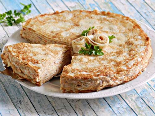 10 тонких блинов, 250 г филе соленой сельди, 1 крупная луковица, 1 крупная морковь, 2 яйца, 140 г сливочного сыра, 1-2 ст. л. сметаны (20% жирности), растительное масло для обжаривания лука, 1 веточка зелени петрушки (для украшения) – по желанию.