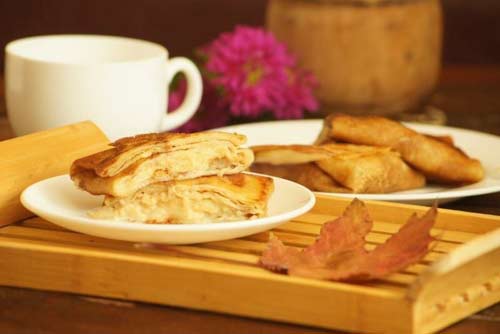 180 г готовых блинов, 3 яблока, 3 ч. л. сгущенного молока, 1 ст. л. сливочного масла, 2 г корицы.