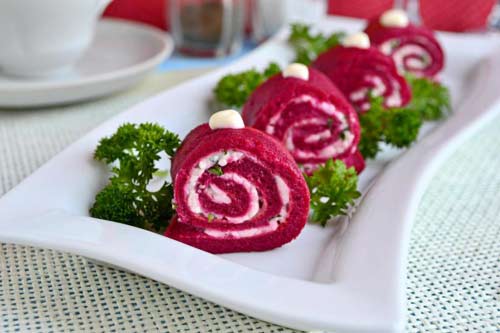 Свекольные блины с творожной начинкой