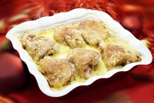 1 кг картофеля, 5-6 куриных бедра, 100 г сыра, 100 мл воды, 1 луковица, 3 ст. л. сметаны, 3 ст. л. растительного масла, соль, черный молотый перец – по вкусу.