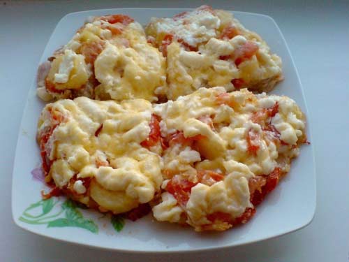 250 г мяса (свинины) 4 картофелины, 2 луковицы, 1 большой помидор, майонез, сыр, приправа, соль – по вкусу.