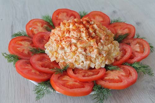 Отваренное куриное филе нарежьте небольшими кусочками. Твердый сыр нарежьте небольшими кубиками. Яйца отварите вкрутую, остудите и нарежьте небольшими кусочками. Добавьте кукурузу, нарезанные кусочками ананасы, соль и перец. Заправьте салат майонезом и хорошо перемешайте. Уложите помидоры, нарезанные кружочками, на блюдо в виде лепестков. В центр выложите салат и посыпьте его молотой паприкой и веточками укропа.