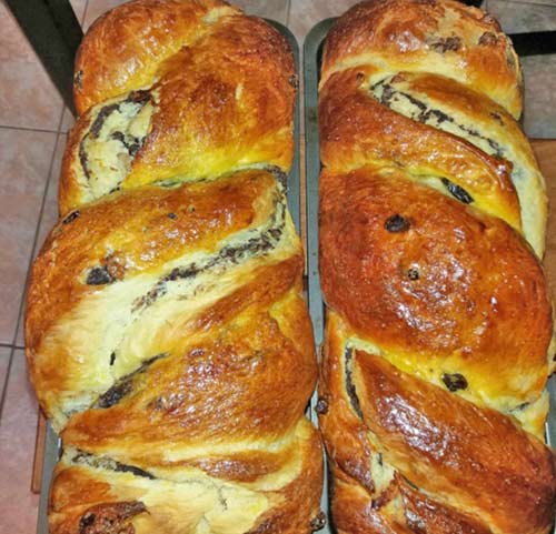 Для теста: 1 кг муки, 600 мл молока, 250 г сахара, пачка сливочного масла, 2 пакетика сухих дрожжей, 6 яичных желтков, 200 г изюма, 1 ч. л. экстракта ванили, 1 ч. л. ромовой эссенции, цедра апельсина и лимона, 1/2 ч. л. соли. Для начинки: 6 яичных белков, 600 г молотых орехов, 4 ст. л. какао, 200 г сахарной пудры.