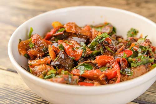 Овощи хорошо помойте и уложите на противень, застеленный пергаментной бумагой. В баклажане сделайте небольшие надрезы. Отправьте овощи в духовку, разогретую до 170°C. Запекайте с режимом конвекции в течение 15 минут, потом сразу же переложите их в ледяную воду, остудите и очистите от кожуры. У баклажан отрежьте хвостики, нарежьте кубиками и положите в глубокую миску. Очищенные помидоры нарежьте кубиками и добавьте к баклажанам. У сладкого перца удалите семена и добавьте к остальным овощам. Добавьте очищенный чеснок, пропущенный через пресс. Туда же положите измельченную зелень и базилик. Всё посолите и поперчите по вкусу, добавьте красный перец и любимые овощи. Закуску заправьте растительным маслом, перемешайте и подавайте.