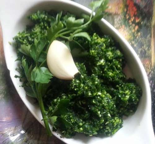 1 пучок кинзы, 1 головка чеснока, 5 жгучих зеленых перца.