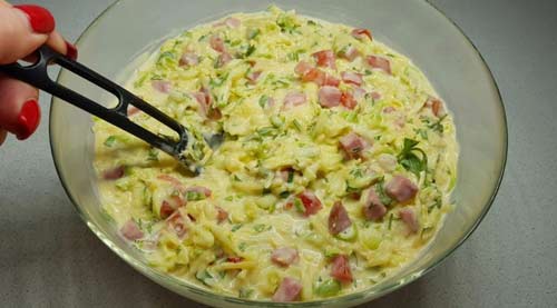 800 г кабачков, 200 г твердого сыра, 2 яйца, 150 г сметаны, 1 ст. муки, 1/2 ч. л. соды, зелень, колбаса (или любое отварное мясо), помидоры, соль, черный молотый перец – по вкусу.