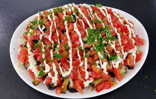 200 г куриного филе, 400 г баклажанов, 200 г помидоров, 200 г болгарского перца, 1 луковица, 3 яйца, 20 г зелени (укропа и петрушки), 150 г майонеза, 4 зубчика чеснока. Чтобы замариновать лук: 1 ч. л. сахара, 1/2 ч. л. соли, 1 ст. л. уксуса (9%), 200 мл кипятка.