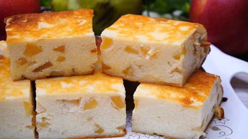 100 г сливочного масла, 150 г сахара + 2 ст. л. для посыпки, 4 яйца, 600 г творога, 4 ст. л. манной крупы, 4 крупных яблока.