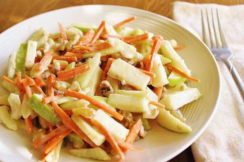 Вымойте овощи и яблоки, последние очистите. Смешайте капусту, морковь, перец и яблоки, нарезанные тонкой соломкой. Добавьте рубленый лук и заправьте смесью майонеза, сахара и лимонного сока.