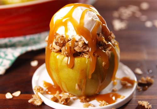 Очистите и нарежьте кубиками 1 яблоко. У остальных срежьте верхушки и удалите мякоть. Смешайте овсяные хлопья, масло, сахар и корицу. Затем добавьте кубики яблока и аккуратно перемешайте. Положите подготовленные яблоки в форму, выложите в них начинку и поставьте в разогретую до 200°C духовку на 35 минут. Перед подачей можно выложить на каждое яблоко по шарику мороженого и украсить карамелью.