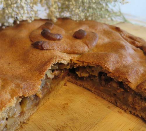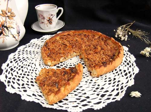 Размороженное тесто раскатайте толщиной примерно 3-5 мм. Возьмите большую тарелку и обведите ножом по окружности, вырезав ровный круг. Смажьте форму сливочным маслом (маргарином) и выложите в него тесто. Оно должно быть чуть больше дна формы, чтобы сделать бортики. Орехи мелко порубите, но не в крошку. Добавьте овсяные хлопья и жидкий мёд, тщательно перемешайте. Проколите тесто в нескольких местах вилкой, чтобы при выпечке тесто не вздувалось. Выложите начинку в середину теста и ровно распределите по всей поверхности, оставляя края по 2 см свободными. Загните края, формируя бортики и отправьте на 10-15 минут в духовку, разогретую до 180°C.