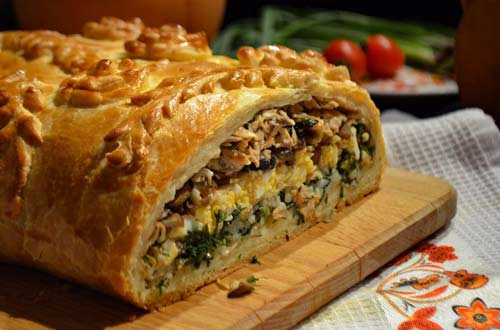 Для теста: 400 г муки, 3 ст. л. растительного масла, 25-30 г дрожжей, 1,5 ст. молока, 2 яйца. Для начинки: 200 г риса, 150 г сливочного масла, 1 кг филе рыбы (без костей и кожи), 5 яиц, сваренных вкрутую.