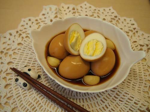 6 куриных яиц или 10 перепелиных, 1/4 луковицы, 2 ст. л. соевого соуса, 1/2 г перца горошком, 1 г корня петрушки, 1 ч. л. водки, 1 ч. л. сахара, 1/2 ч. л. имбиря, 1/2 ч. л. корицы, 1 салат-латук, 1 лавровый лист, морская соль – по вкусу.
