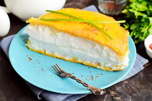 Отделите белки от желтков. Желтки выложите в небольшую миску, а белки поместите в емкость для взбивания с высокими бортами. Добавьте к белкам щепотку соли и на маленькой скорости начните взбивать. Когда структура белков разрушится, увеличьте скорость работы миксера. Когда белки начнут белеть и принимать стойкую форму, добавьте сок дольки лимона и взбивайте еще в течение 2 минут. В миску к желткам влейте молочные сливки, добавьте щепотку соли и интенсивно взболтайте вилкой. В небольшой сковороде разогрейте оливковое масло, влейте взбитые желтки и равномерно распределите их по дну. Должен получиться тонкий омлетный блинчик. Как только блинчик схватится, выложите пышные взбитые белки и равномерно распределите их по всей сковороде. Продолжите готовить омлет на медленном огне не менее 15 минут. В конце обязательно проверьте омлет на готовность: легонько коснитесь пальцем белка, если он не липнет и достаточно упругий, то омлет готов. Готовый омлет аккуратно переложите на доску, разрежьте пополам и сложите половинки друг с другом, то есть белок должен оказаться внутри. Получившийся омлет разделите на порции и подавайте к столу.