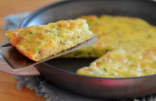 При желании, можно разнообразить блюдо болгарским перцем, цукини, грибами, тыквой, цветной капустой или брокколи. Кабачок помойте, очистите, отрежьте хвостик и натрите на крупной терке. Лишнюю жидкость можно отжать. Лук очистите, вымойте и мелко нарежьте. Зелень промойте, обсушите и мелко порубите. Выложите в холодную сковороду кабачки и лук, поставьте на огонь и начните медленно нагревать. Если необходимо поджарить до корочки, понадобится немного масла, но калорийность блюда увеличится. Лучше просто прогреть на среднем огне, пока овощи не выпустят сок и немного не протушатся в нём. Весь процесс займет не более 10 минут. Яйца разбейте в глубокую миску, добавьте соль и зелень, немного взбейте вилкой или венчиком до однородности. Пропаренные овощи равномерно распределите по дну сковороды, залейте яичной смесью и поставьте в духовку, разогретую до 180°C. Запекайте, пока вся масса не загустеет (около 15 минут, в зависимости от диаметра сковороды). Готовое блюдо достаньте из духовки, дайте остыть в сковороде минут 5 и можно подавать к столу.