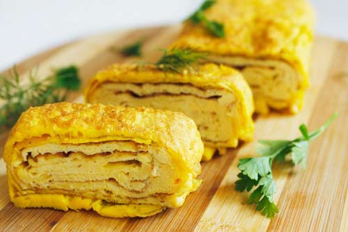 Яйца взбейте венчиком и процедите через сито, чтобы избавиться от неоднородных частиц. Добавьте специи: соевый соус, рисовый уксус и сахар. Количество сахара регулируйте. Если хотите не очень сладкий омлет, насыпьте неполную чайную ложку. Сахар можете заменить сахарозаменителем. Теперь всё снова хорошенько взбейте, чтобы сахар растворился. Разогретую сковороду слегка смажьте маслом, вылейте на нее половник яичной смеси и распределите по сковороде круговыми движениями. Огонь ставьте ниже среднего, чтобы омлетная масса схватилась, но не подгорела. Когда омлет схватится, сверните его прямо на сковороде в рулетик. Рулетик оставьте под бортиком сковороды. Сковороду снова слегка смажьте маслом, налейте половник омлетной массы, круговыми движениями распределив по сковороде так, чтобы масса попала и под рулетик. И снова готовьте до момента, когда омлет схватится. Затем аккуратно сверните рулет в обратную сторону, то есть наверните его на ранее жареный рулетик. И так делайте, пока не закончится яичная смесь. Пока он горячий, придайте ему аккуратную прямоугольную форму. Коврик для сворачивания роллов оберните пленкой, выложите на нее рулет и, подворачивая коврик, придайте омлету прямоугольную форму. Готовый омлет Тамаго нарежьте острым тонким ножом на кусочки.