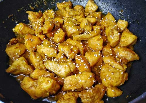 Налейте оливковое масло в сковороду. Куриное мясо нарежьте кубиками, готовьте в закрытой сковороде до белого цвета, добавьте нарезанный лук. Посолите, поперчите, накройте крышкой и готовьте 5 минут. Мелко нарежьте чеснок и имбирь, добавьте в сковороду. Полейте курицу лимонным соком, соевым соусом и мёдом. Посыпьте кунжутным семенем, перемешайте. Закройте крышку. Минут через 5 снимите крышку и готовьте до полного испарения жидкости.