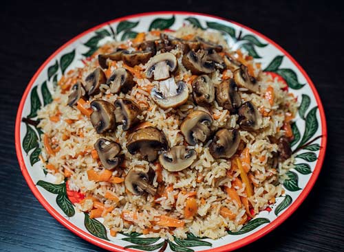 500 г риса, 300-400 г шампиньонов, 2 моркови, 2 луковицы, 100-150 г растительного масла, свежая зелень, соль, черный молотый перец – по вкусу.