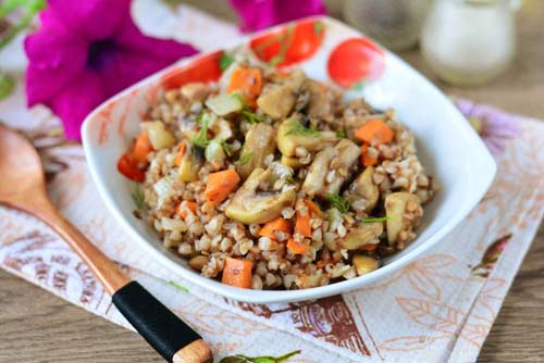 1/2 ст. гречневой крупы, 1 морковь, 1 цуккини, 1 луковица, 3-4 помидора, 150 г шампиньонов, растительное масло для обжаривания, соль, черный молотый перец – по вкусу.