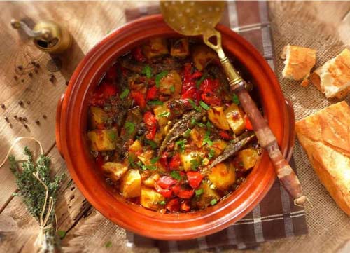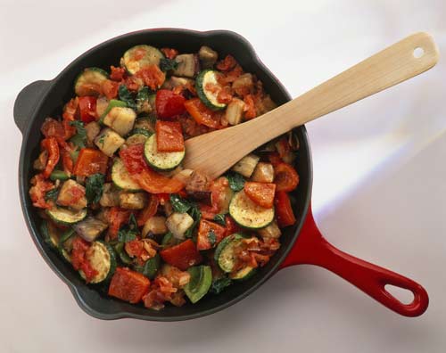 100 г баклажана, 50 г моркови, 30 г репчатого лука, 100 г молодого кабачка, 70 г стручковой фасоли, 50 г болгарского перца, 40 г помидоров, 7 г чеснока, 2 сушеных лавровых листа, 30 г оливкового масла, 6 г острой приправы, 1 ч. л. молотой паприки, 6 г соли.