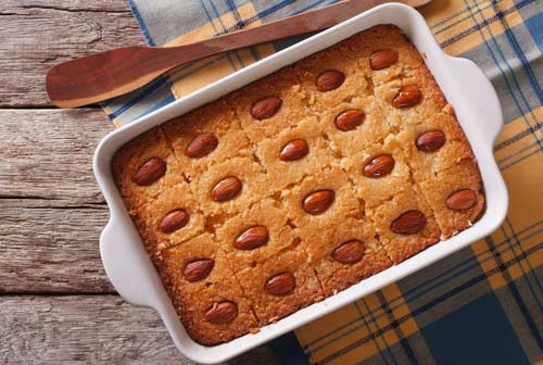 Соедините муку, кокосовую стружку, сахар, разрыхлитель и манную крупу, перемешайте до равномерного смешивания. Влейте подсолнечное рафинированное масло и кефир. Вбейте яйцо и всё перемешайте до однородного состояния. Выложите тесто в прямоугольную форму и разровняйте поверхность. Поставьте в предварительно разогретую до 180°C духовку на 35 минут. Для сиропа соедините сахар, воду и лимонный сок. Проварите сироп минут 5-6 на плите или 4 минуты в микроволновой печи. Достав басбусу из духовки, разрежьте ее, не вынимая из формы, на небольшие прямоугольники или квадраты одинакового размера. На каждый кусок, слегка утопив, положите по орешку, семечке или изюминке. Полейте сразу же горячим сахарным сиропом и подавайте.