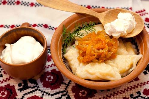Муку смешайте с 1/3 ч. л. соли, влейте рафинированное подсолнечное масло, затем сразу же влейте кипяток и замесите тесто, сначала ложкой, затем рукой. Получившееся тесто накройте пищевой пленкой и оставьте на 15 минут. Если готовый свиной фарш постный, добавьте в него небольшую часть пропущенного через мясорубку свиного сала. Квашеную капусту слегка отожмите от рассола, затем покрошите не слишком мелко, чтобы в начинке не было слишком длинных частичек, и добавьте в свиной фарш. Лук очистите и нарежьте максимально мелко или пропустите через мясорубку. Добавьте лук в фарш с капустой. Посолите, поперчите и тщательно перемешайте начинку. Отдохнувшее тесто обомните и разделите на несколько частей. Налепите вареники, выложите их на поднос в один слой и отправьте в морозильную камеру. Перед подачей вареники отварите около 3-5 минут после повторного закипания в большом количестве подсоленной воды. Подавайте с жареным на подсолнечном масле луком и со сметаной или сливочным маслом.