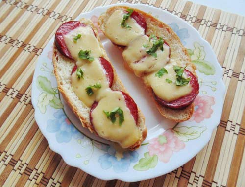 Булочки для хот-догов разрежьте вдоль на две половинки. Смажьте каждую из четырех частей булочек сливочным маслом. Колбасу очистите от оболочки и нарежьте кружочками. Выложите на смазанные маслом половинки булочек кружочки колбасы. Сыр нарежьте пластинками, покройте ими колбасу. Уложите бутерброды в форму для запекания и поставьте в разогретую до 200°C градусов духовку на 10 минут. Подавайте в горячем виде, не давая расплавленному сыру остыть. По желанию горячие бутерброды можно посыпать измельченной свежей зеленью.