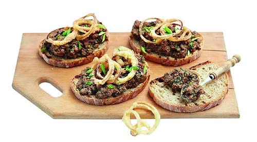 Очистите яблоко, натрите на терке, смешайте с измельченной луковицей и 2 зубчиками чеснока. Добавьте 1 ст. л. соевого соуса, щепотку сахара и 100 мл воды. Варите 15 минут, процедите. Нарежьте куриную печенку кусочками, посолите и обваляйте в муке. Обжарьте в оливковом масле, 5 минут. Добавьте 4 ст. л. вашего соуса, 2 рубленых стебля зеленого лука и немного кинзы, тушите 1 минуту. Взбейте блендером так, чтобы остались небольшие кусочки печенки. Взбейте яйцо, 100 мл ледяной воды, 100 г муки и соль, чтобы оставались комочки. Тонко нарежьте 1 луковицу, разберите на колечки. Обмакивайте колечки в тесто и жарьте во фритюре до золотистой корочки. Обжарьте куски вашего любимого хлеба на сковороде без масла или подсушите в тостере. Выложите печенку на поджаренный хлеб горкой. Сверху уложите колечки жареного лука.