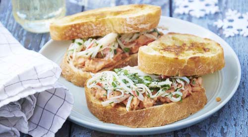 Для пасты мелко нарежьте или разберите руками мясо краба и половину смешайте с другими ингредиентами. Оставшегося краба крупно нарежьте, смешайте с пряными травами и соком половины лимона. Сбрызните оливковым маслом, посолите, поперчите, перемешайте и оставьте на 30 минут. Хлеб немного подсушите на сухой сковороде и сбрызните маслом 4 куска. Разложите крабовую пасту, на нее – куски краба. Накройте оставшимся хлебом и подавайте.