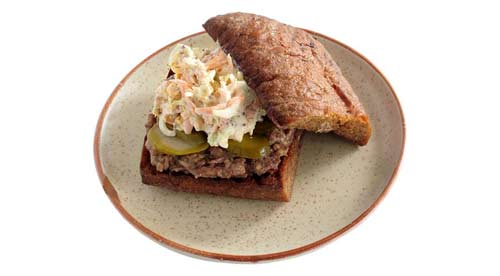 Из банки с говяжьей тушенкой удалите большую часть жира. Выложите тушенку вместе с соком в сковороду и прогрейте, разделяя мясо на волокна. Выпарьте жидкость. Нашинкуйте очень тонко листья пекинской капусты. Натрите на терке очищенную морковку. Смешайте капусту и морковку, заправьте смесью майонеза с йогуртом, горчицей и лимонного сока с цедрой. Нарежьте тонкими дольками маринованные огурцы. Поджарьте в тостере или на сковороде (можно только с одной стороны) ржаной хлеб. Выложите на половину кусков хлеба теплую тушенку. На нее – огурцы, затем салат. Накройте оставшимся хлебом, хорошенько прижмите и подавайте.