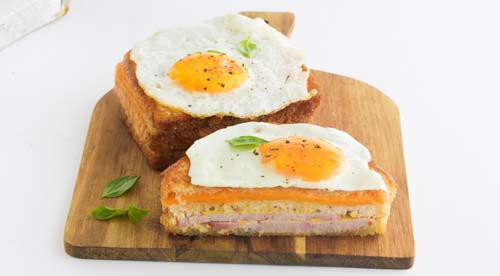 Нарежьте хорошо плавящийся сыр тонкими ломтиками. Отрежьте от ветчины из индейки 2-3 тонких ломтика и сложите друг на друга, слегка промазав дижонской горчицей. Намажьте 3 куска хлеба сливочным маслом со всех сторон. Соберите сэндвич: хлеб, ветчина, снова хлеб, сыр, опять хлеб. Придавите. Обжарьте на сковороде на среднем огне с двух сторон. Поджарьте яичницу-глазунью на сливочном масле, посолите, уложите сверху на сэндвич и подавайте.