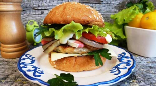 Приготовьте фарш для котлет из курятины, лука и яичного белка. Хорошо вымесите и отбейте его. Через сервировочное кольцо выложите его на сковороду и пожарьте круглые котлеты. Лук нарежьте кольцами или полукольцами и обжарьте его до золотистого цвета. Помидор и авокадо нарежьте колечками. Крабовое мясо – кусочками. Булочку разрежьте пополам, поджарьте на сковороде, где жарился лук и смажьте майонезом. На теплую булочку уложите пластинку сливочного сыра, мясную котлету, крабовое мясо, обжаренный лук, колечки помидора и авокадо. Сверху накройте листом салата и листиками петрушки. Закройте второй половиной булочки.