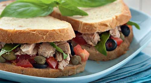 1 батон цельнозернового хлеба, 600 г тунца в собственном соку, 5 средних мясистых помидоров, 100 г маслин, 1 ст. л. мелких каперсов, 1 маленький пучок базилика, 8 ст. л. оливкового масла, 2 ст. л. лимонного сока, соль, молотый черный перец – по вкусу.