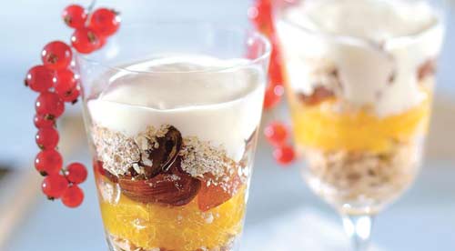 4 больших апельсина, 2-3 средние хурмы, 6 плодов кураги, 2 горсти облепихи, 240 г йогурта жирностью 2,5%, 1-2 ст. л. мёда (по желанию).