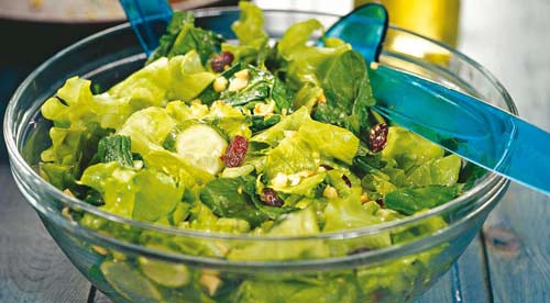 1 пучок зеленого лука, 500 г свежего шпината, 50 г очищенного фундука, 1 кочан салата латук, 3-4 огурца, 3 ст. л. растительного масла, соль, изюм – по вкусу.