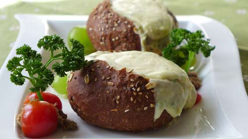 С хлебцев ножом срежьте верхушки, выньте хлебную мякоть. Твердый сыр натрите на терке. Поставьте кастрюлю на медленный огонь и растопите в ней сливочное масло, добавьте муку. Тщательно перемешайте до достижения однородной консистенции. Влейте бульон, посолите и поперчите по вкусу. Введите оба сыра, перемешайте. Влейте соус внутрь хлебцев, украсьте мякишем и зеленью, помидорами черри и виноградом и подавайте горячим.