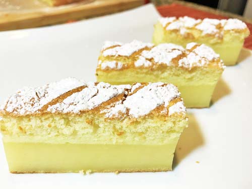 Отделите желтки от белков. Добавьте к желткам сахар, ванилин и хорошо взбейте всё вместе миксером. Масса должна посветлеть и увеличиться в объеме. Влейте растопленное и охлажденное сливочное масло. Добавьте воду, потом молоко и всыпьте муку. Взбейте всё вместе до однородного состояния. Отдельно взбейте белки с солью до устойчивых пиков. Частями добавьте в тесто. Перемешайте всё ложкой до однородности. Тесто должно получиться достаточно жидкое, по консистенции как кефир. Форму для выпечки смажьте маслом и вылейте готовое тесто. Выпекайте около часа при температуре 160°C. Затем остудите его прямо в форме, нарежьте на порционные кусочки и подавайте, присыпав верх сахарной пудрой (по желанию).
