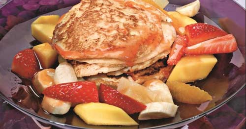Отделите яичные белки. Желтки взбейте с солью. Добавьте молоко и сливочное масло. Размешивая, всыпьте муку. Яичные белки взбейте в пену, добавьте в тесто. Перемешайте, накройте и оставьте в теплом месте на полчаса. Смешайте апельсиновый сок с крахмалом и сахаром. Варите, помешивая, 5 минут. Смешайте тесто с рисом и испеките блинчики. Подавайте с нарезанными фруктами, полив соусом.