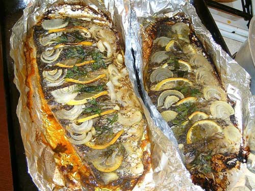 Рыбу разморозьте, промойте и нарежьте на большие порционные куски. Противень застелите фольгой необходимого размера. Разложите куски рыбы практически вплотную друг к другу по центру фольги. Обильно и равномерно посыпьте приправой для рыбы. Лук нарежьте кольцами, лимон – тонкими полукружками. Уложите лимон равномерно на куски рыбы, а поверх – кольца лука. Излишек лука выложите по краям рыбы. Посолите лук, стараясь не попасть на рыбу, и приправьте хмели-сунели. Накройте всё вторым слоем фольги, загибая края наверх и закручивая их, чтобы не вытекла жидкость. Примните фольгу, следите, чтобы углы не оставались пустыми – загните их. Затем проколите ее в нескольких местах сверху для выхода пара. Дайте рыбе промариноваться в таком виде 20-30 минут. Запекайте в духовке при 160°C в течение 20 минут. Готовое рыбу прямо в фольге поместите в глубокую посудину, удалите верхний слой фольги, загните края и подавайте как самостоятельное блюдо, с овощным салатом или отваренным рисом.