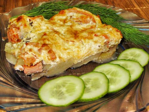 700 г рыбного филе, 6-8 картофелин, 2 луковицы, 1-2 моркови, 1 ст. сметаны, 1 ст. тертого твердого сыра, 1 крупное яйцо, 2-3 ст. л. растительного масла, соль, черный молотый перец, специи – по вкусу.