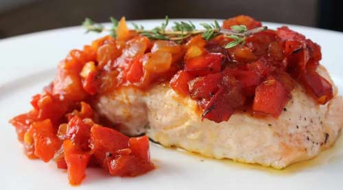 Очистите лук и чеснок. Лук мелко нарежьте, чеснок мелко порубите. Болгарский перец очистите от семян и перегородок, нарежьте квадратиками. Помидор ошпарьте кипятком, а затем поместите в холодную воду, снимите с него кожуру и нарежьте кубиками. В сковороде на оливковом масле слегка обжарьте лук и чеснок (5 минут), помешивая. Добавьте перец и жарьте еще 5 минут. В сковороду положите помидор, выдавите сок половины лимона, посолите, поперчите по вкусу и перемешайте. Базилик нарежьте не очень мелко, отправьте в сковороду к овощам и тушите всё вместе 5-6 минут. Рыбу вымойте, обсушите бумажными полотенцами и выложите в форму для запекания. Поверх рыбы распределите овощной соус. Запекайте рыбу в духовке при температуре 180°C около 30 минут.