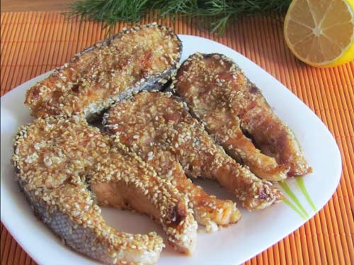 Рыбу вымойте и промокните бумажным полотенцем. Для маринада: масло, лимонный сок, специй, мелко нарезанную зелень и соль смешайте венчиком. Рыбу опустите в маринад, хорошо смажьте и поставьте в холодильник на полчаса. Потом каждый стейк обваляйте сначала в муке, затем во взбитом яйце и наконец в семенах кунжута. Выложите на разогретую сковороду с маслом и жарьте по 5-6 минут с каждой стороны в зависимости от толщины кусков.