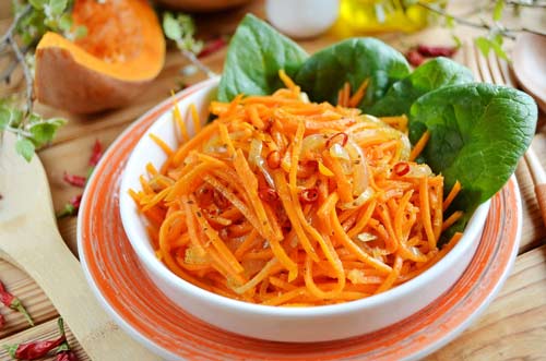 400 г тыквы, 1 ст. л. мёда, 1 луковица, 2 зубчика чеснока, 2-3 острых перца (или 1/3 обычного перца чили), 50 мл подсолнечного масла, 2 ч. л. приправы для моркови по-корейски, 2 ст. л. яблочного уксуса, 1/2 ч. л. соли.