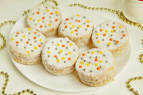 Сливочное масло для крема заранее размягчите при комнатной температуре. В кастрюльке или сотейнике соедините сахар, яйца, мёд, соду и 50 г сливочного масла. На небольшом огне, постоянно помешивая, доведите до пенной массы (не кипятить) и затем перелейте в глубокую миску. Частями добавьте муку. Замесите тесто. Если необходимо, в процессе можно добавить еще немного муки. Разделите тесто на три равные части, сформируйте колобки и переложите их на присыпанную мукой плоскую тарелку. Уберите в холодильник на полчаса. Затем каждую часть теста раскатайте тонко в форме прямоугольника и переложите на пергамент. Сделайте проколы вилкой и выпекайте при 200°C около 3-5 минут. Готовые коржи остудите. Для крема взбейте в глубокой миске размягченное сливочное масло и вареную сгущенку. Промажьте коржи кремом и сложите один на другой. Формочкой вырежьте пирожные. Если нет подходящей формы, просто нарежьте квадратами. Украсьте по вкусу. Смажьте каждое пирожное остатками крема и обваляйте со всех сторон в кокосовой стружке. Для верха используйте кондитерские украшения.