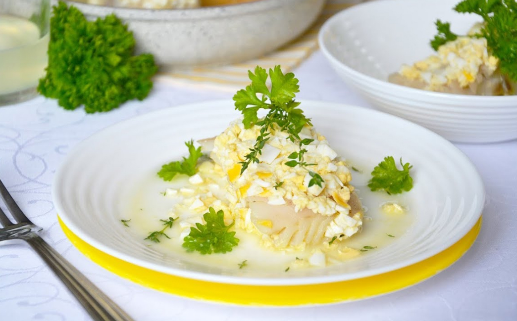 Лук и морковь очистите, и варите 15 минут на медленном огне. Затем в овощной отвар добавьте филе рыбы и лавровый лист. Подержите на огне 20 минут или до полной готовности. В конце посолите и поперчите рыбу. Для соуса растопите сливочное масло в сковороде и обжарьте в нём измельченное отварное яйцо. Готовую рыбу выложите на подогретые порционные тарелки, сверху распределите обжаренные в масле яйца и сразу же подавайте со свежей зеленью.