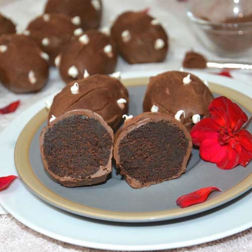 4 яйца, 100 г сахара, 100 г муки, 3 ст. л. какао-порошка. Для крема: 100 г жирных сливок, 100 г темного шоколада, немного сгущенного молока или жирных сливок (по необходимости), 3 ч. л. кокосовой стружки. Для глазури: 100 г белого шоколада, 200 г молочного шоколада, 40-60 мл растительного масла, белый шоколад – для «ростков».