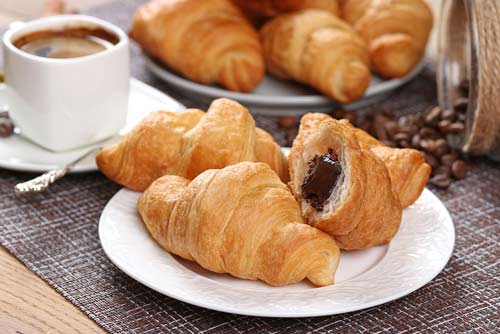 Растопите сливочное масло на паровой бане. Муку просейте и перемешайте с растопленным маслом в отдельной емкости. К ним добавьте молоко, сахар, дрожжи и соль. Тщательно замесите тесто руками, затем накройте его полотенцем и оставьте в тепле на 1,5 часа. Потом переложите тесто в пакет, подержите полчаса в морозилке и еще час просто в холодильнике. Готовое тесто раскатайте в прямоугольник, толщиной примерно 3-4 мм. Разрежьте его на 8 равных треугольников. Плитку шоколада раздробите на мелкие кусочки и выложите у основания каждого треугольника. После скрутите каждый треугольник к узкой стороне. Получившимся рогаликам придайте форму полумесяца. Противень застелите пергаментной бумагой и выложите на нее круассаны. Сверху каждый смажьте яичным желтком. Выпекайте в разогретой до 190°C духовке 15-20 минут.
